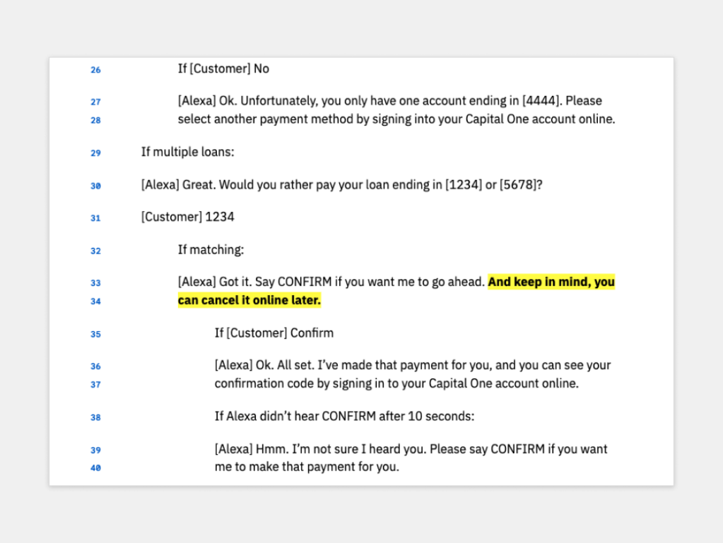 I worked with the engineering team to stage and QA the conversational UX. I also updated the FAQ section on Capital One’s website and wrote copy for Capital One’s Skill profile on the Alexa mobile app as part of the go-to-market plan.