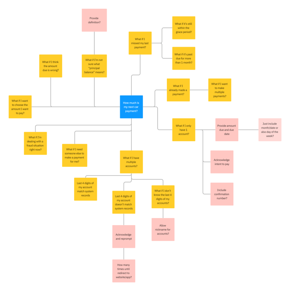 The mindmapping activity helped us scope the MVP use cases and identify hypotheses to test. Each hypothesis acted as a signal for validating a user need. By treating every conversation path as a hypothesis, it reduced the risk of over-designing an interaction that created more work for developers but made little impact on achieving customer and business goals.