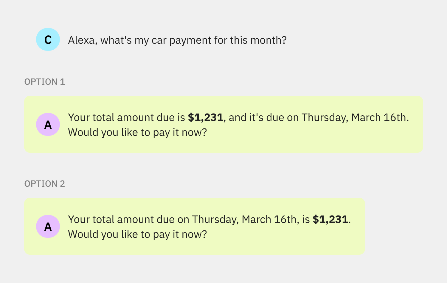 I also explored sequencing nouns and verbs into different orders to ease strain on human memory. If customers have to ask Alexa to repeat information all the time, it would not be a usable experience.