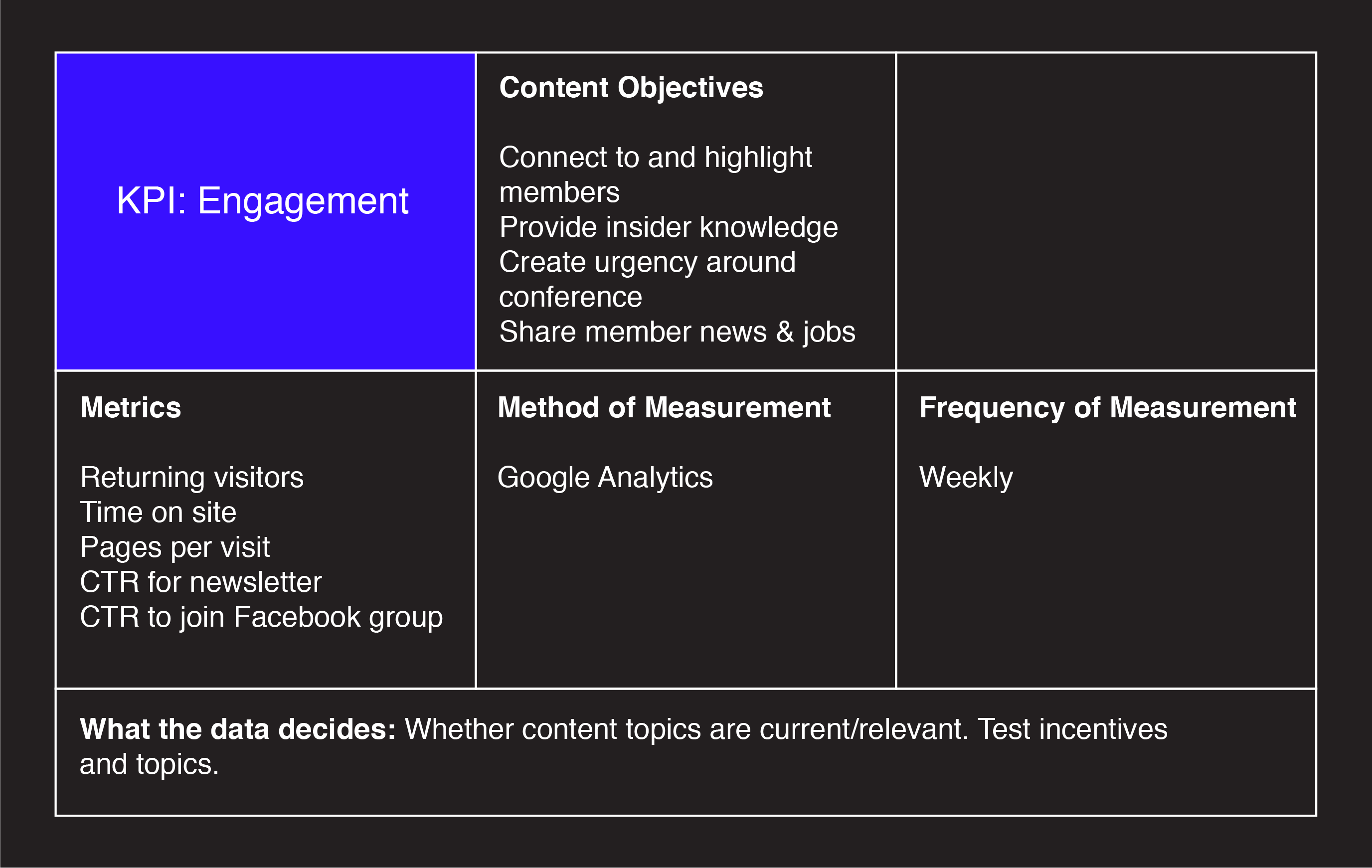- Created a measurement plan that clarified what to measure and why, what each metric tells us, and how to improve content based on insights