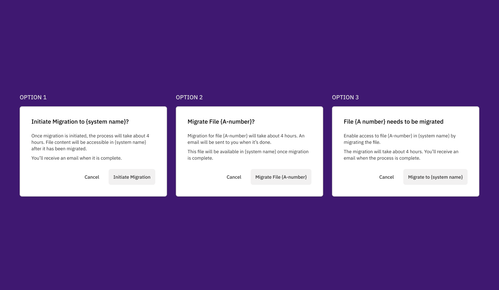 If the user decides not to migrate the file, they have the ability to start it later without going through the modal. I kept the call-to-action (e.g. Migrate to System A) the same as the button label for consistency.