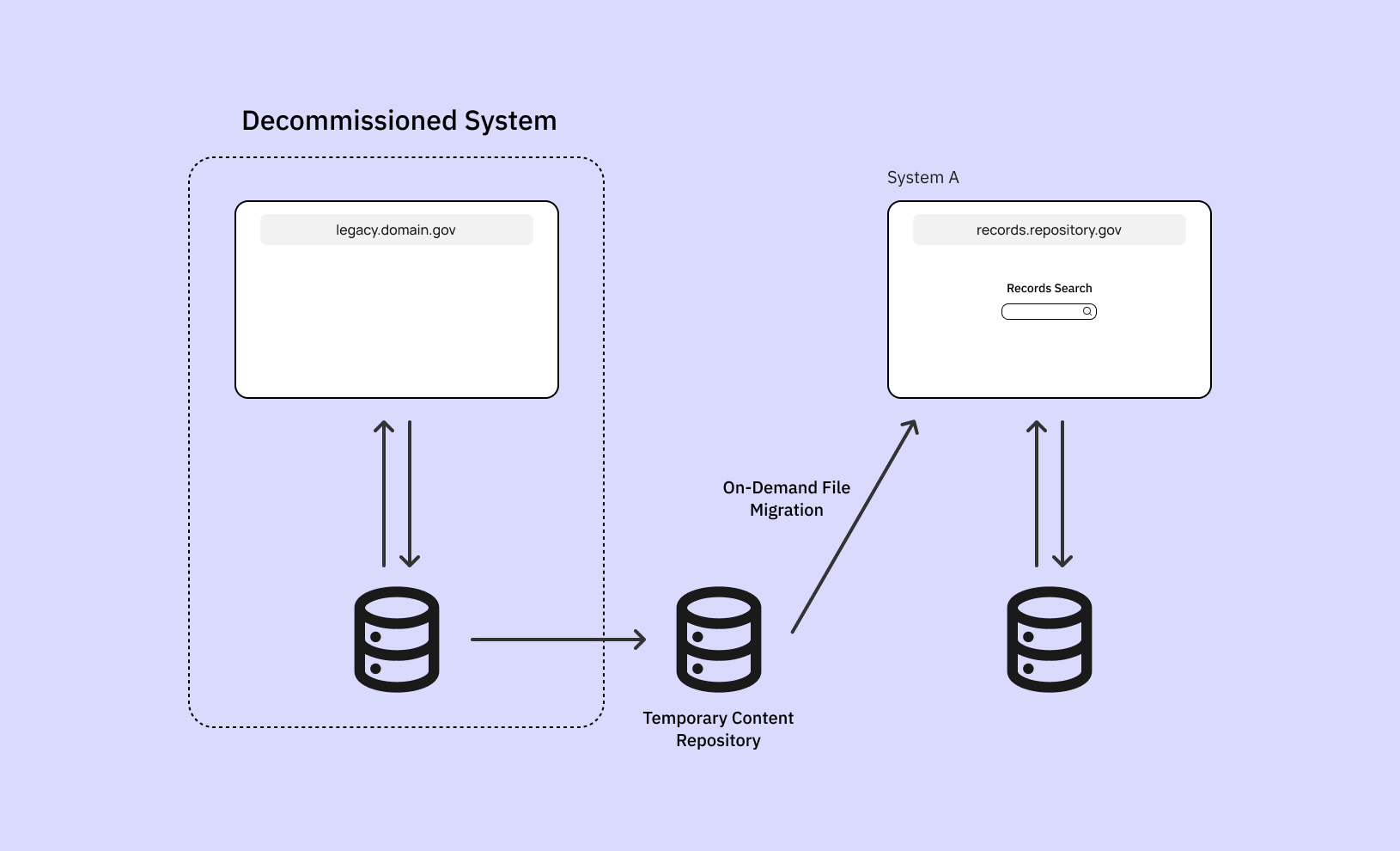 As part of the decommissioning process, records from another information system were transferred to a separate content repository where Federal Employees can request them on-demand. This web application – let’s say, System A – is the main repository that stores records related to immigration benefit applications (ex. applying for a Green Card). Employees rely on these records to approve or deny a benefit.