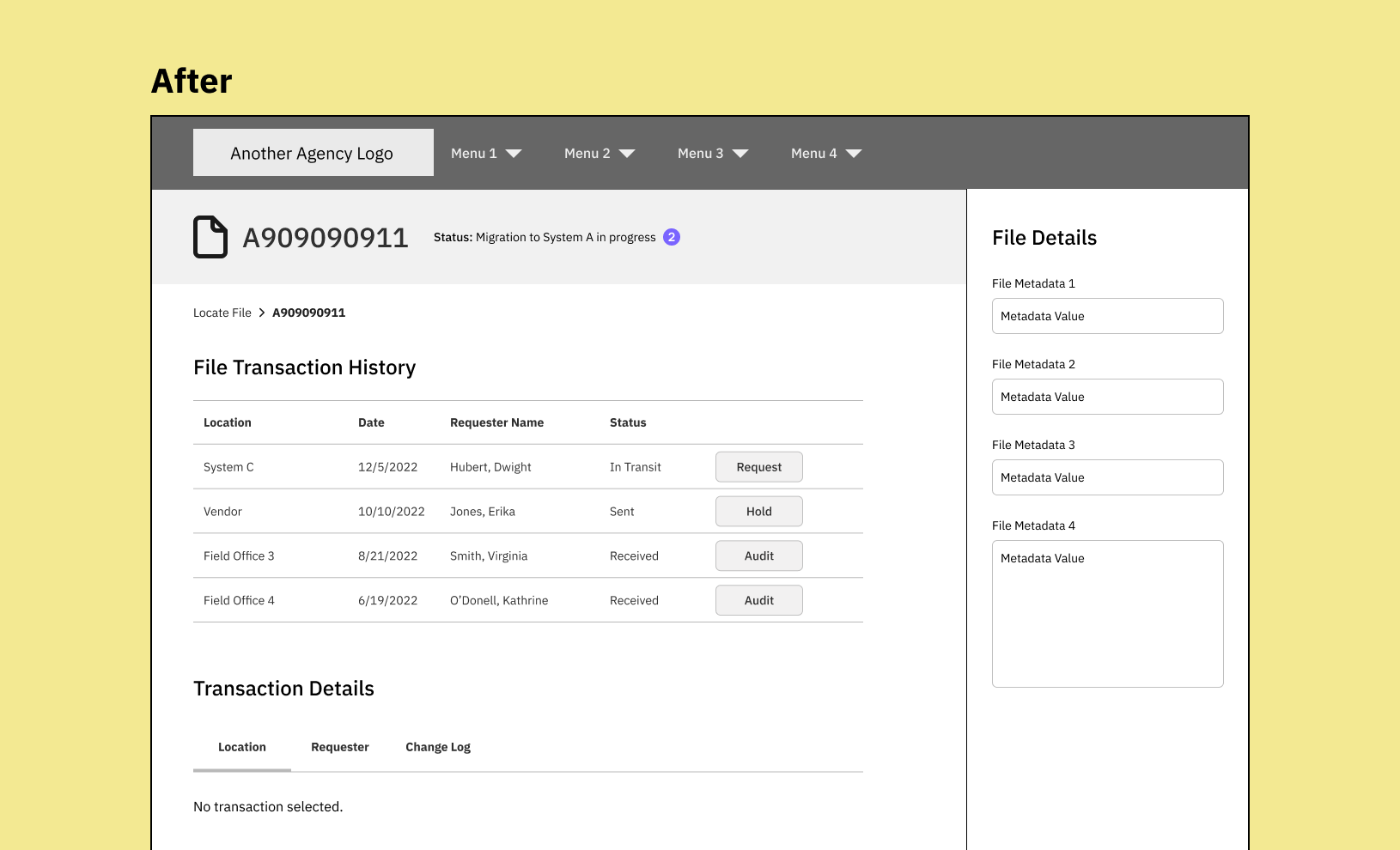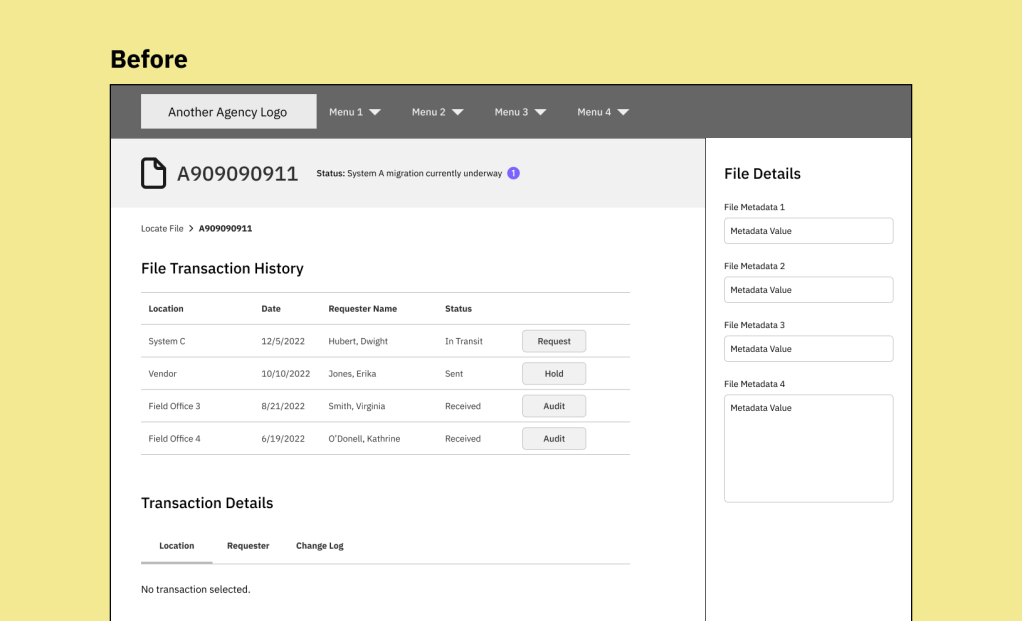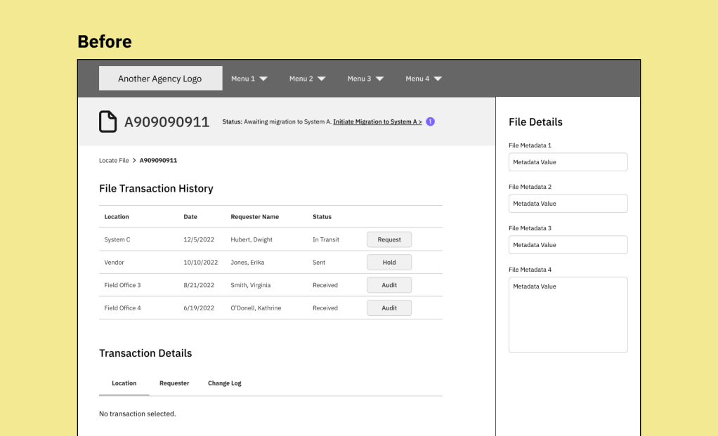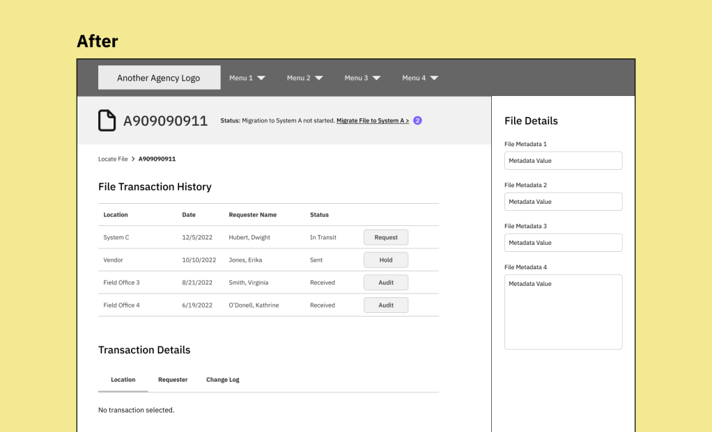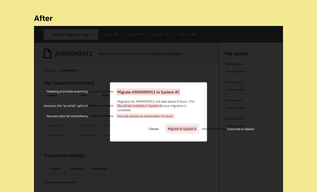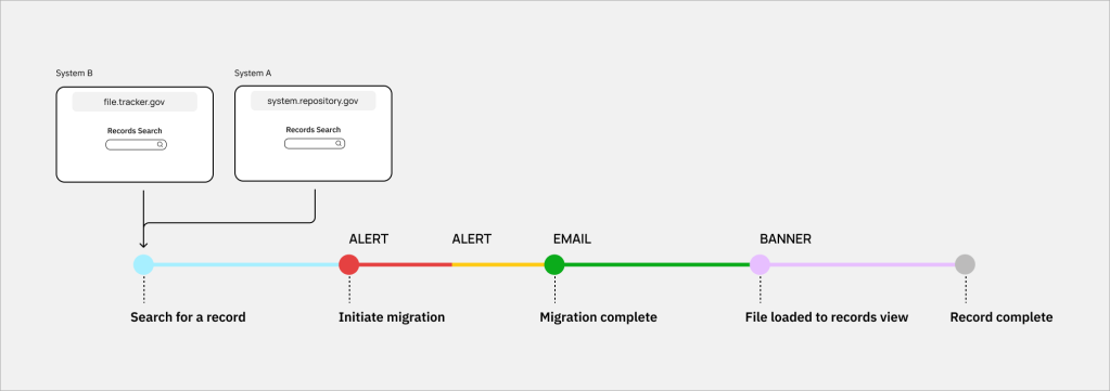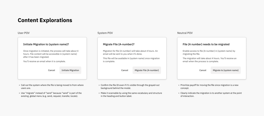 The UX designer and I discovered that users can also start a file migration from System B, which tracks all file movements, both digital and physical, within the Federal Agency. The UX content needed to be as consistent as possible between System A and System B so the messaging doesn’t conflict with one another.