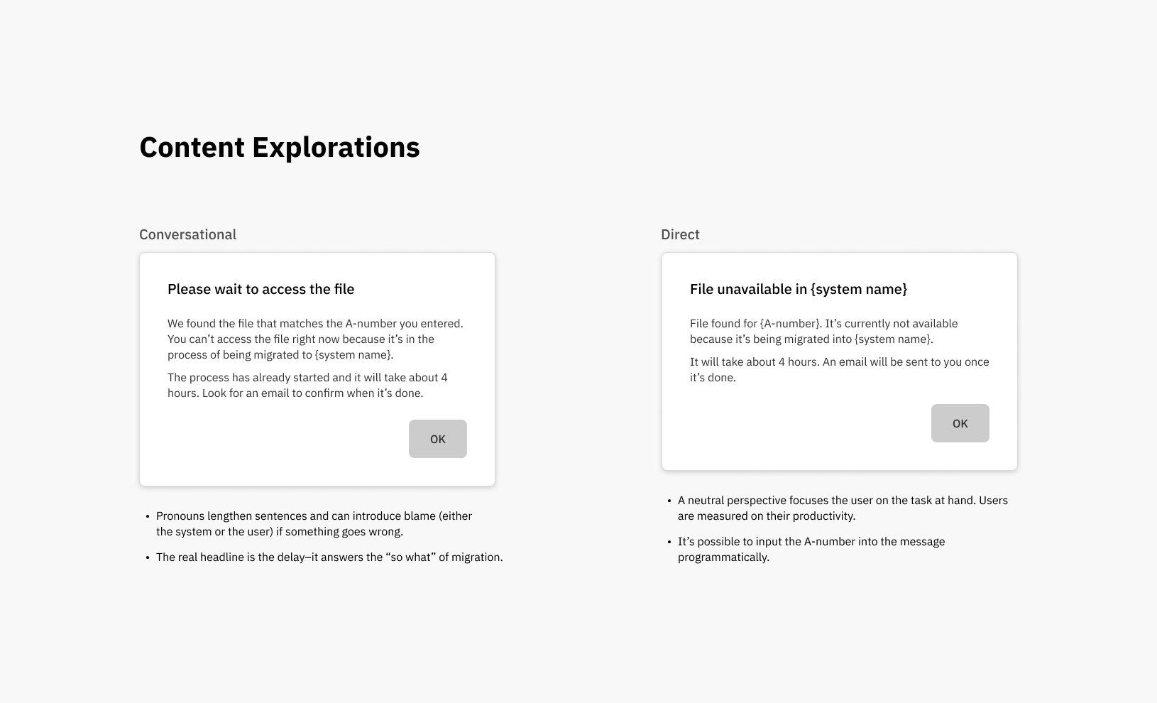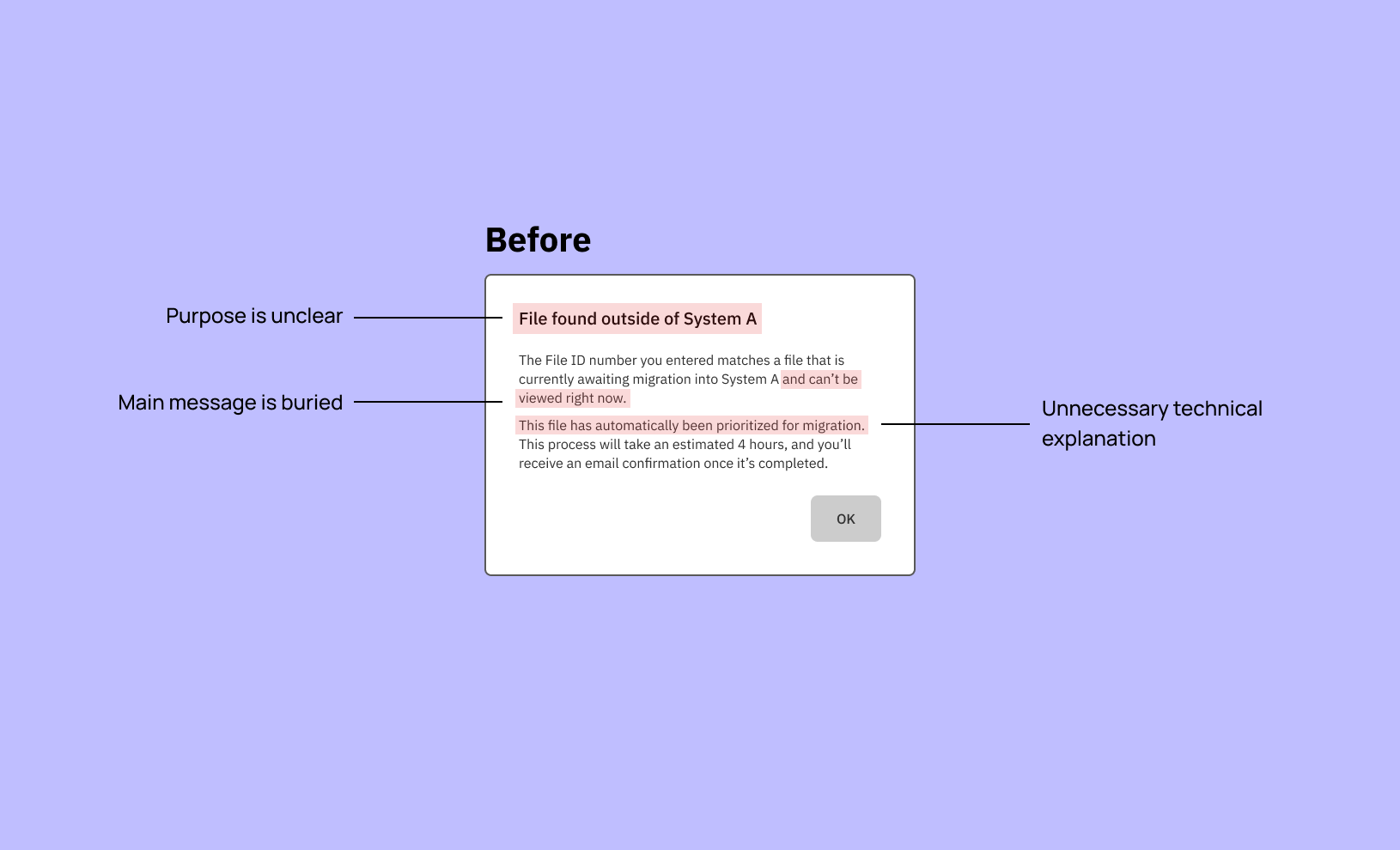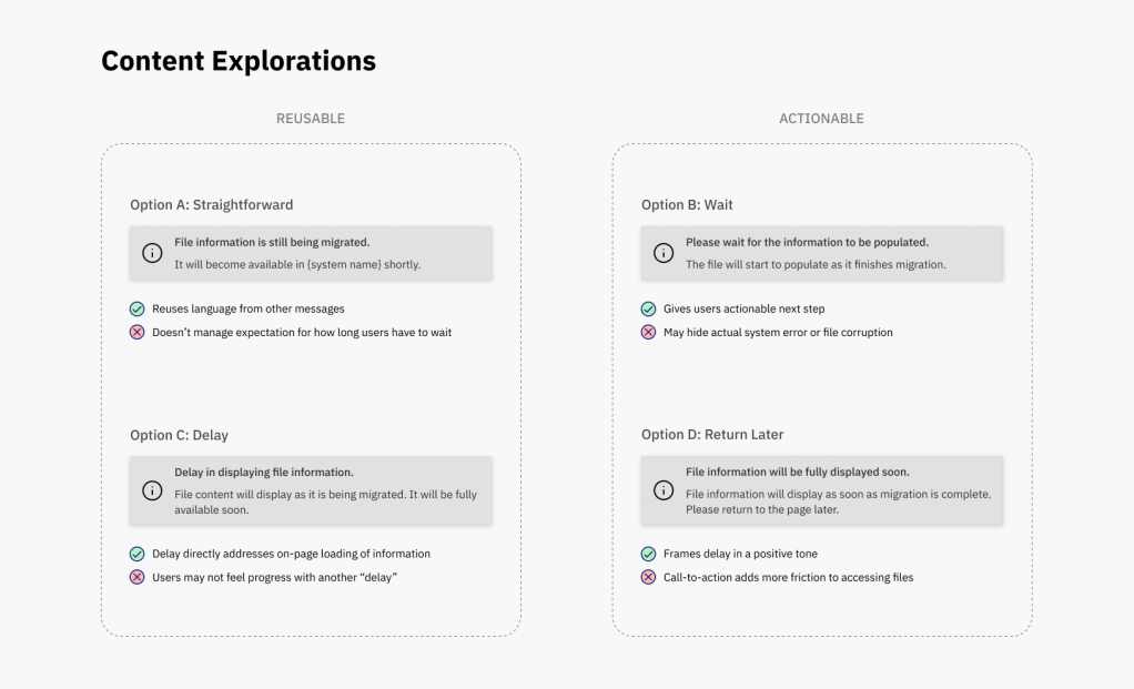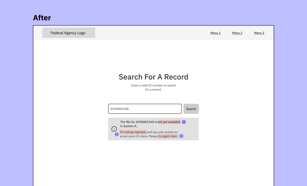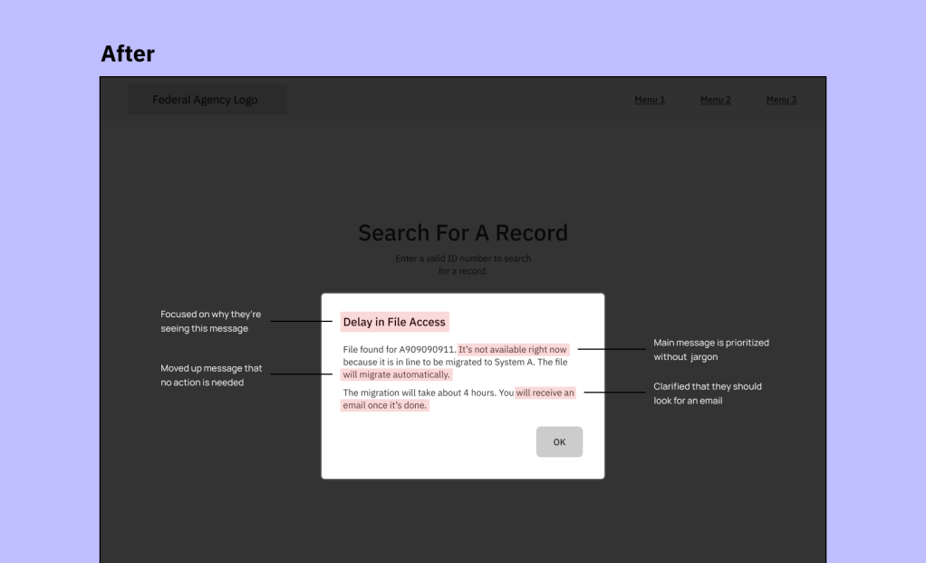 The file migration isn’t automatically initiated until a user searches for it and a matching file is found. The before and after UX content was revised and then reviewed with the team: