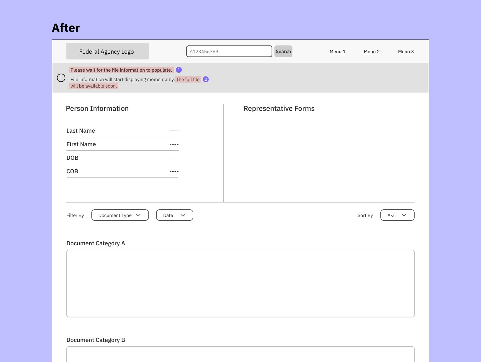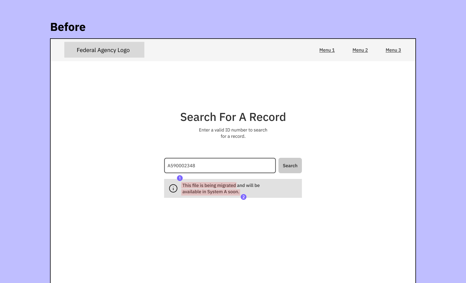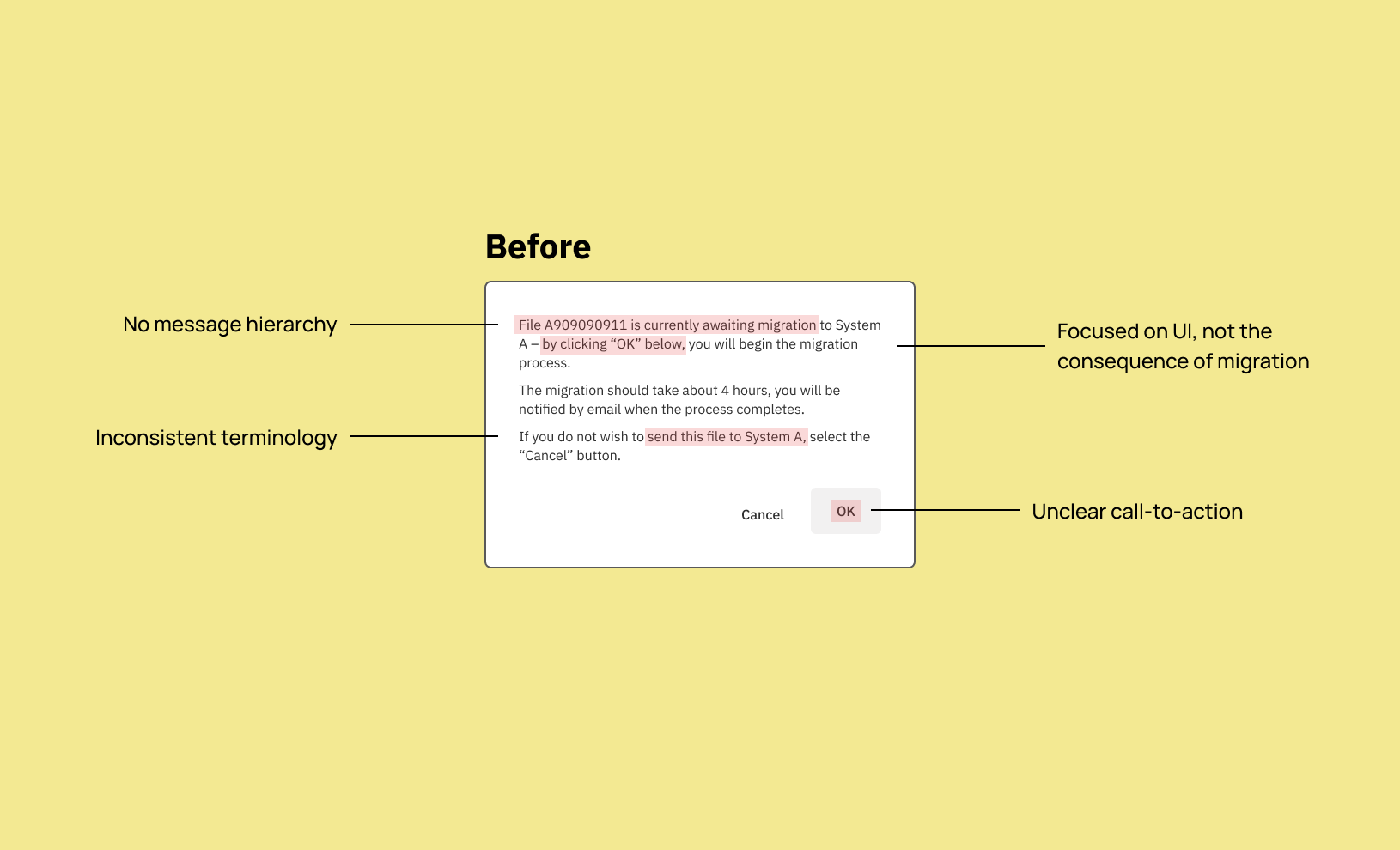 The file migration isn’t automatically initiated until a user searches for it and a matching file is found. The before and after UX content was revised and then reviewed with the team: