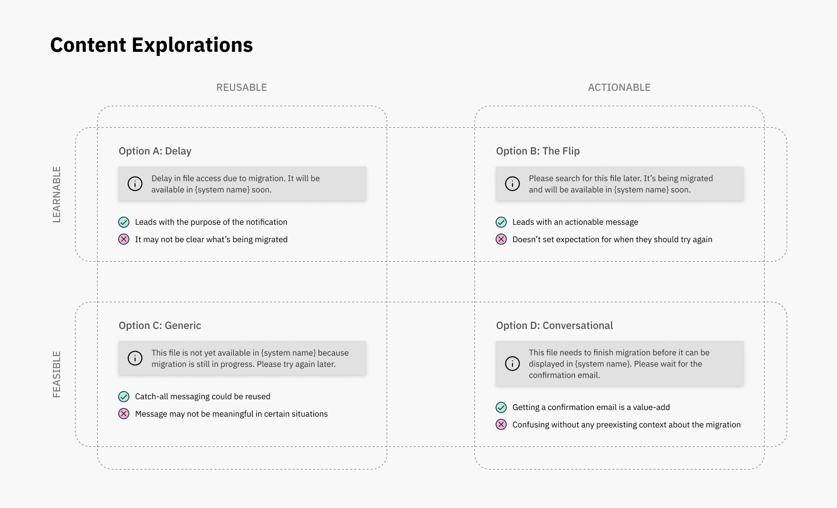 I explored different tradeoffs to balance technical lift (feasible, reusable) and UX (learnable, actionable).