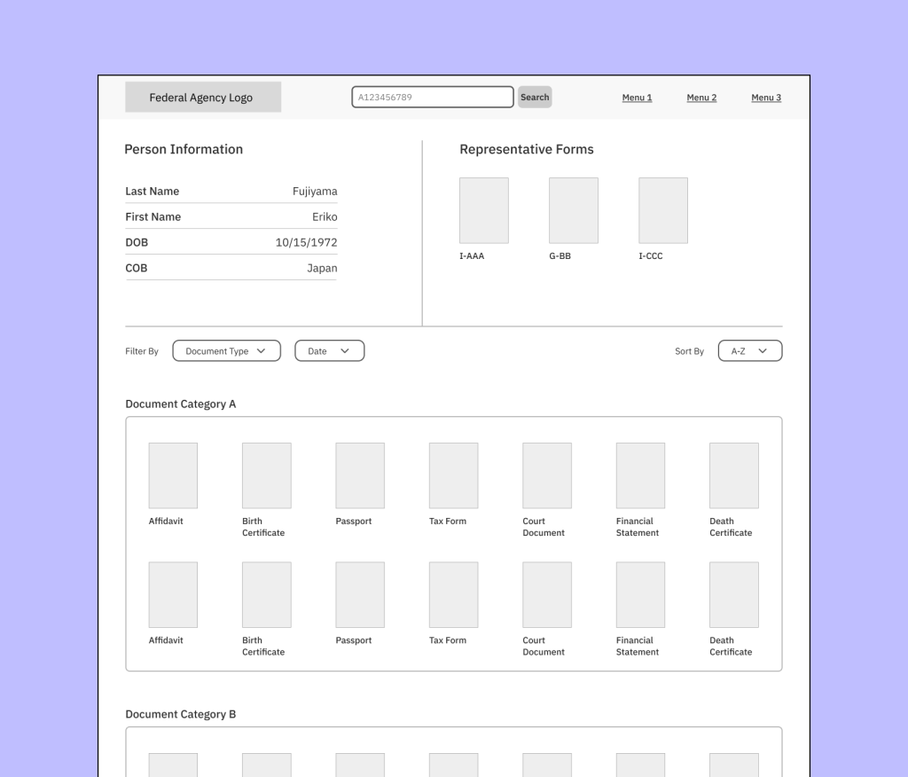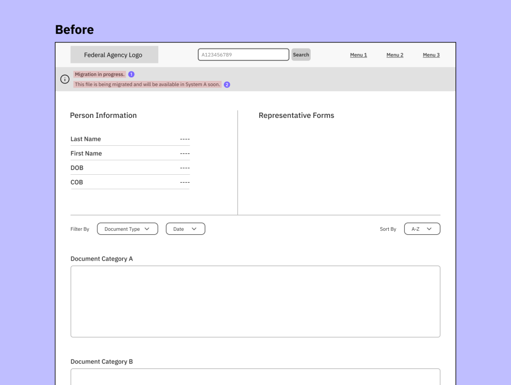 Because this was a Federal Government client, names of internal IT systems and UI features have been redacted. All visuals are recreations in Figma. They’re not 1:1 (for good measure), and all examples do not contain real data.