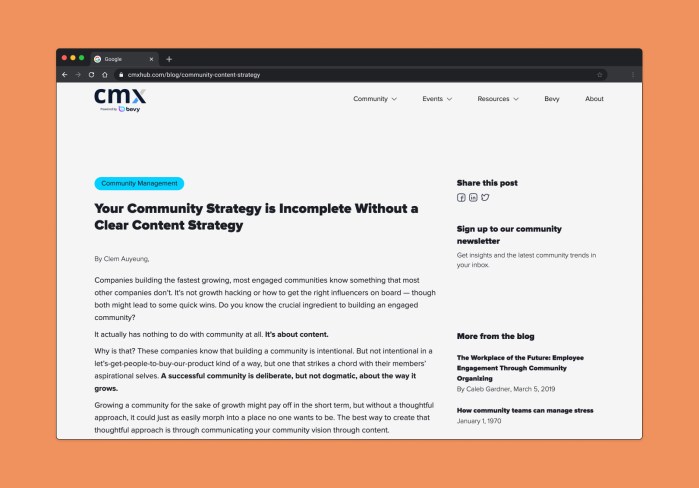 CMX Media (acquired by Bevy) produces conferences, workshops, and training for the world’s largest network of community management professionals. The CEO wanted to create an on-demand training product that could become a recurring revenue stream and replace consulting work. Community members also wanted a comprehensive community strategy, not bits and pieces we’ve been delivering over articles.