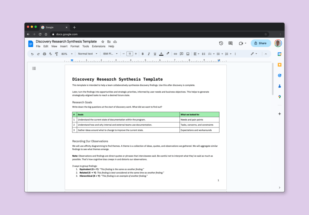 I developed a template to walk my team through the synthesis process in Confluence. This is a recreation with facilitation notes added in. Feel free to make a copy of the workshop template.