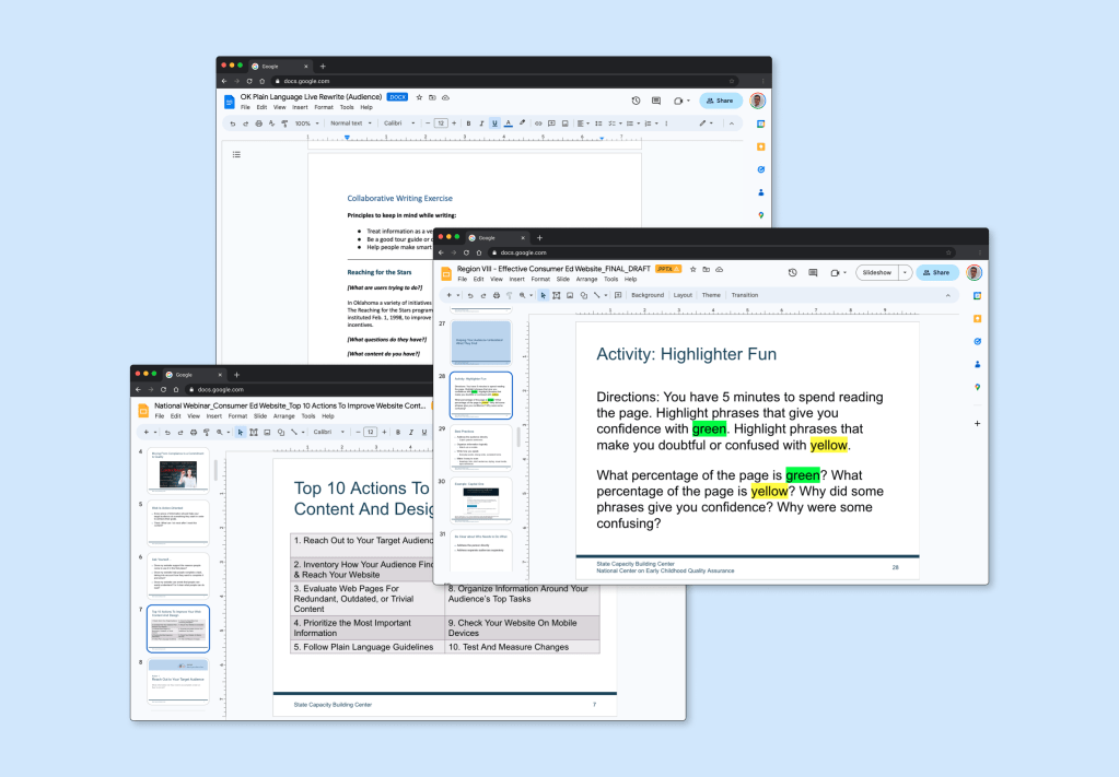 I developed trainings, webinars, and workshops to implement content and UX recommendations from heuristic analyses and content audits. Topics included user-centered design principles, content design best practices, web navigation patterns, Section 508/accessibility standards, and Federal Plain Language guidelines.